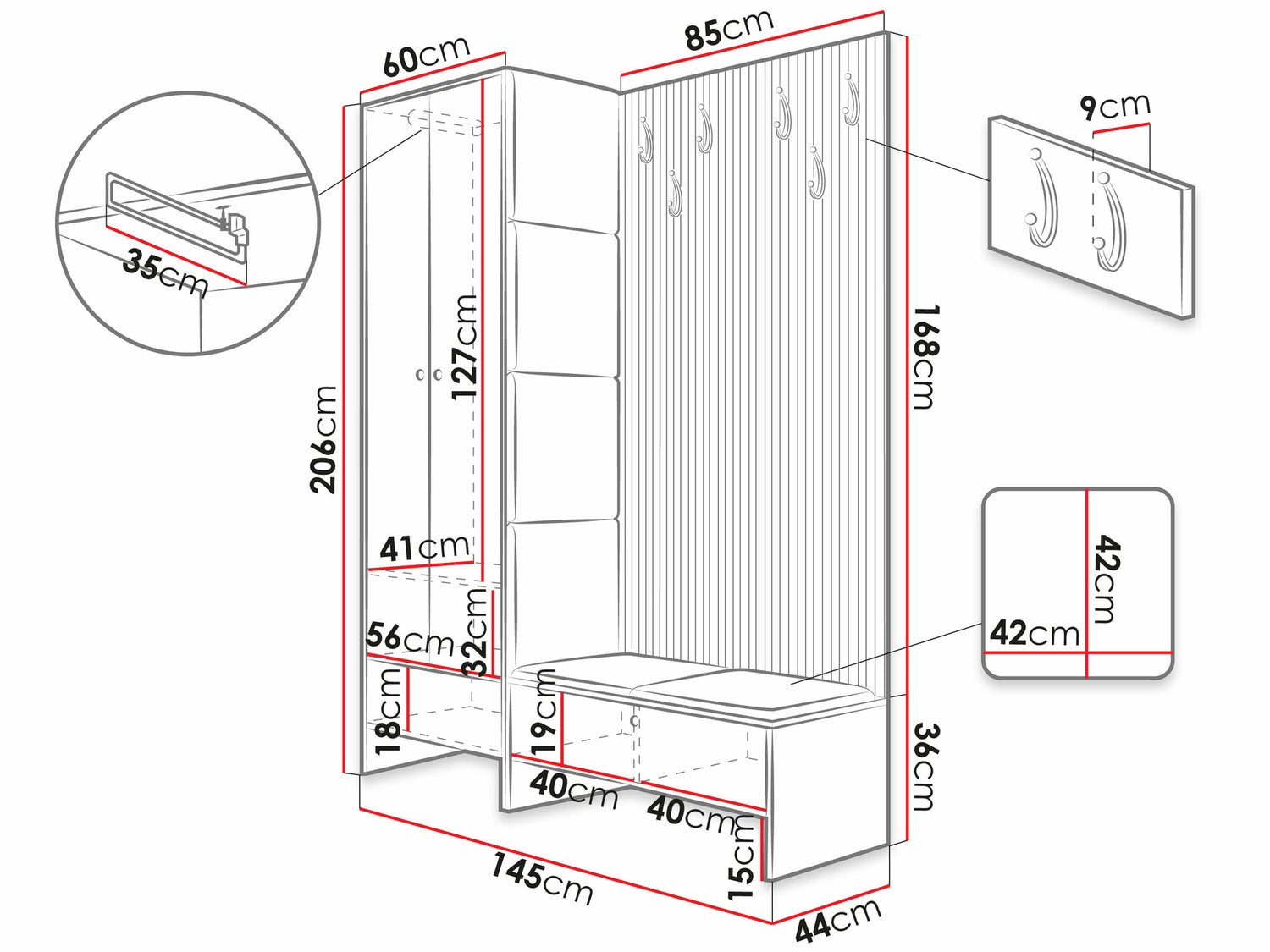 • Dimensioner på garderobeskabe