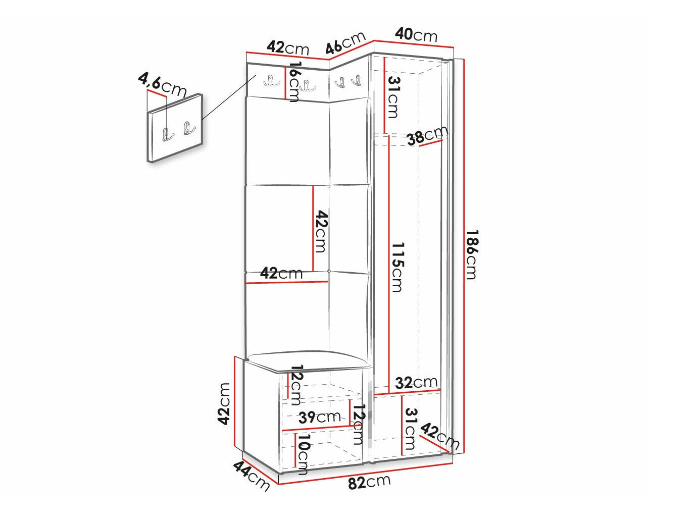 Dimensioner på garderobeskabe186 x 40 x 46 cm