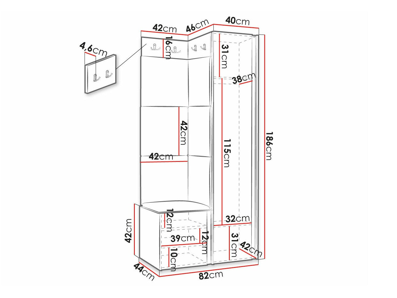 Dimensioner på garderobeskabe186 x 40 x 46 cm