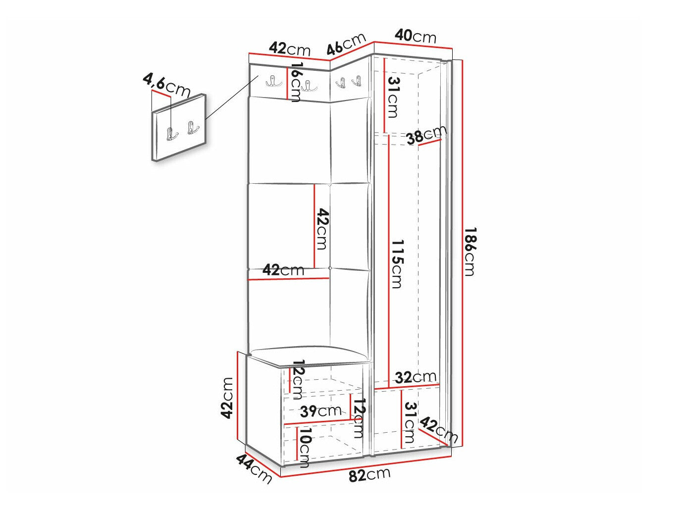 Dimensioner på garderobeskabe186 x 40 x 46 cm