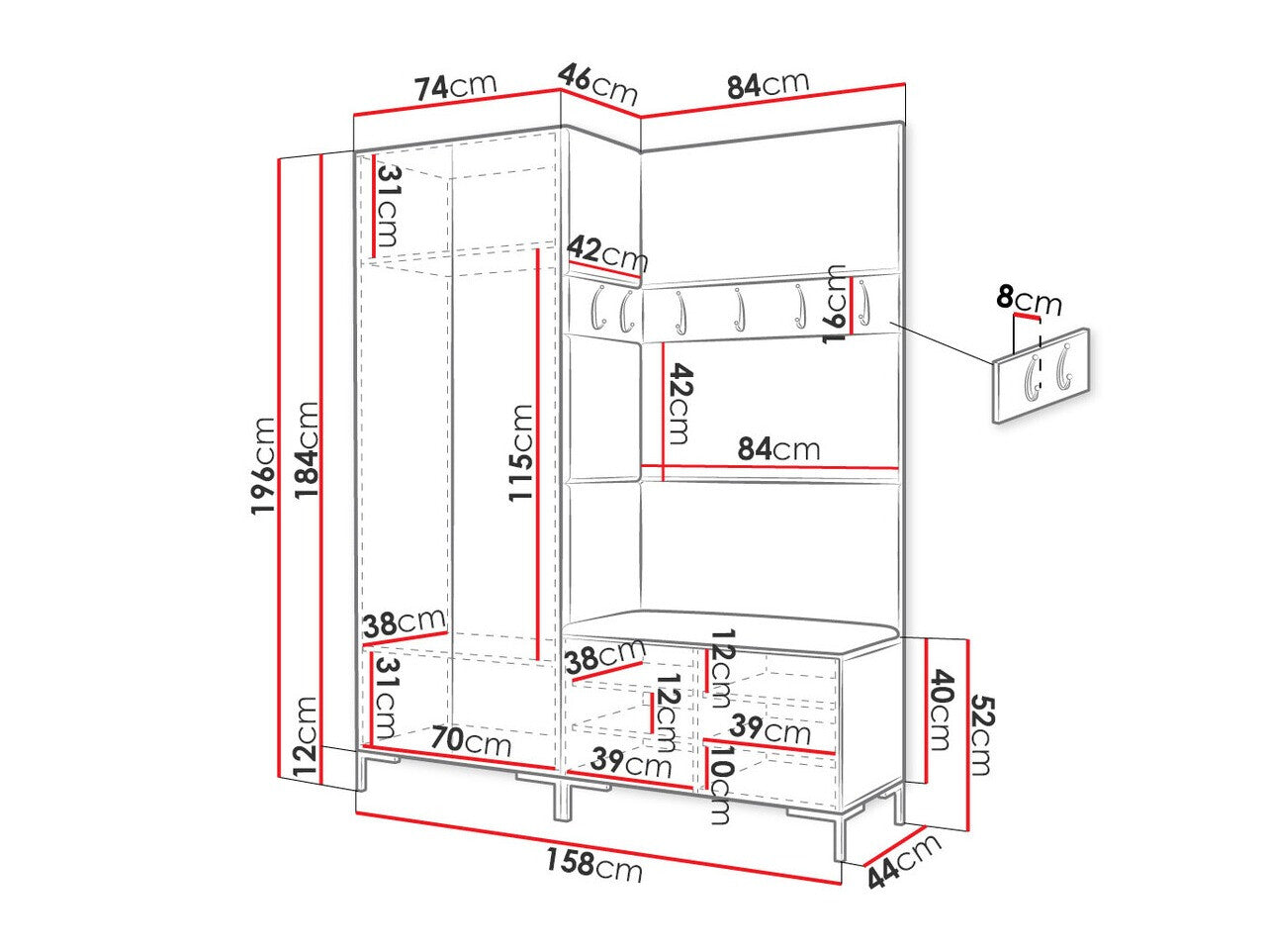 16 x 84 x 8 x 42 x 8 cm