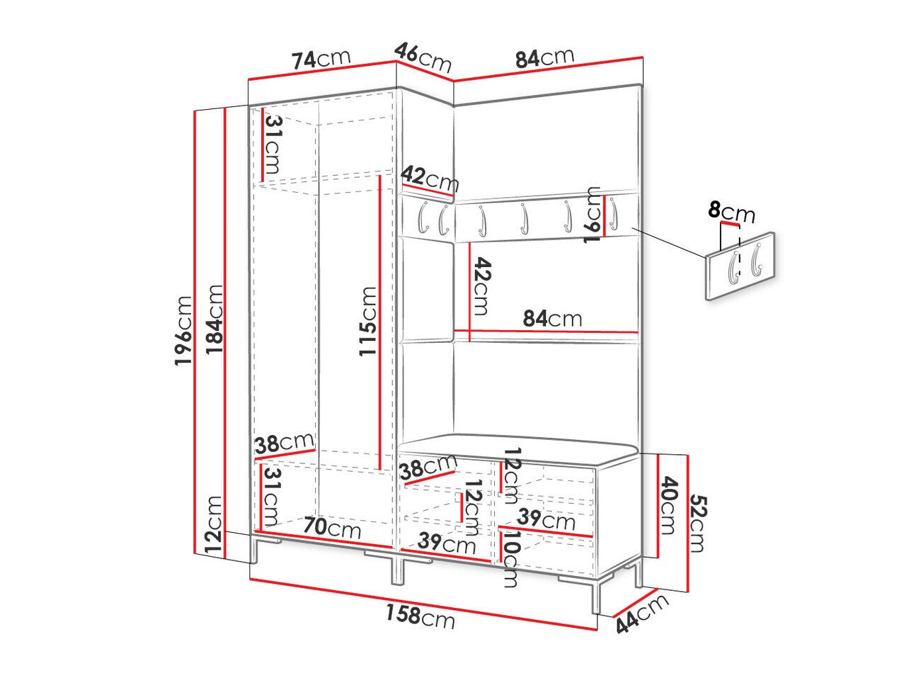 16 x 84 x 8 x 42 x 8 cm