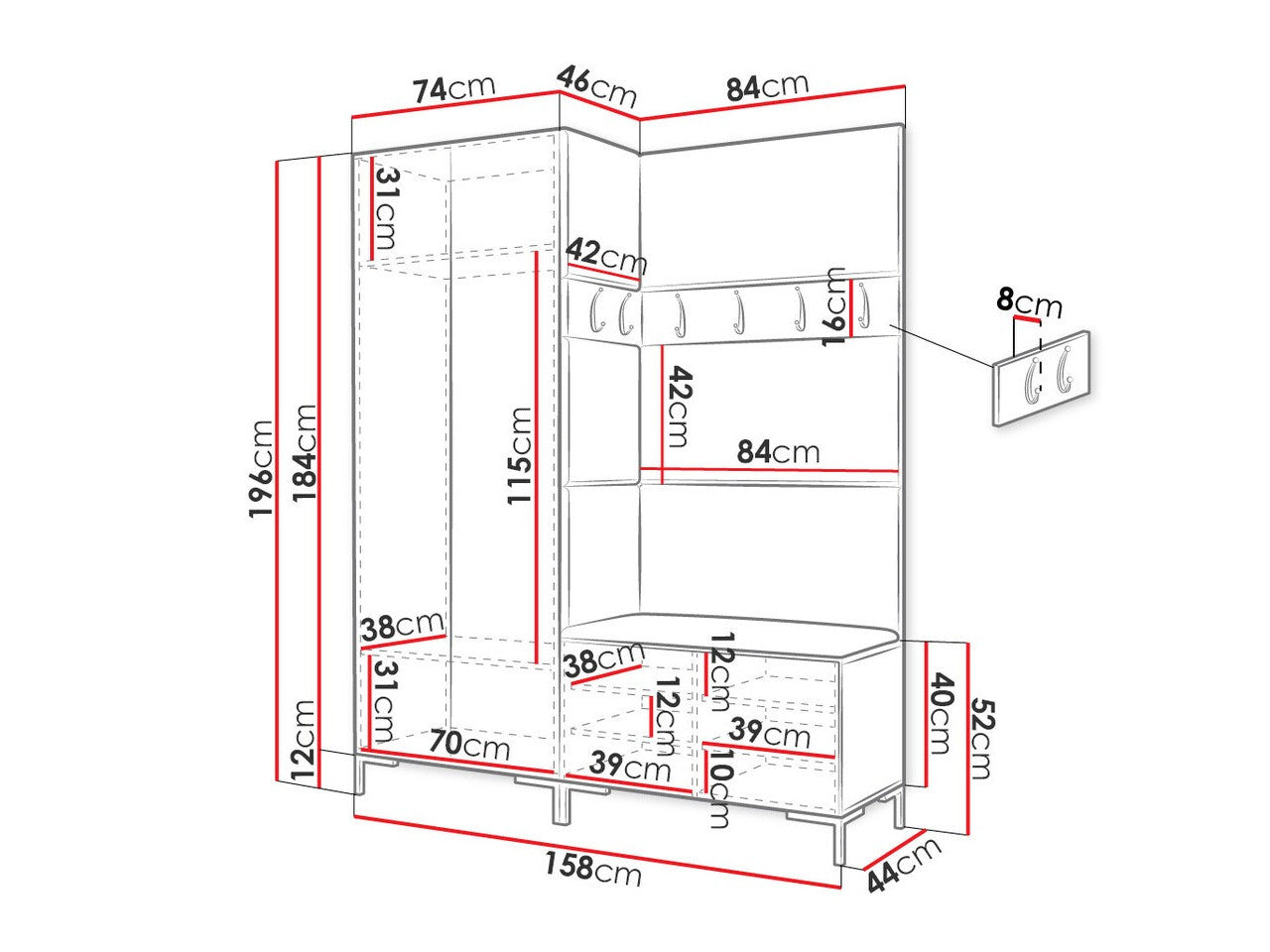 16 x 84 x 8 x 42 x 8 cm