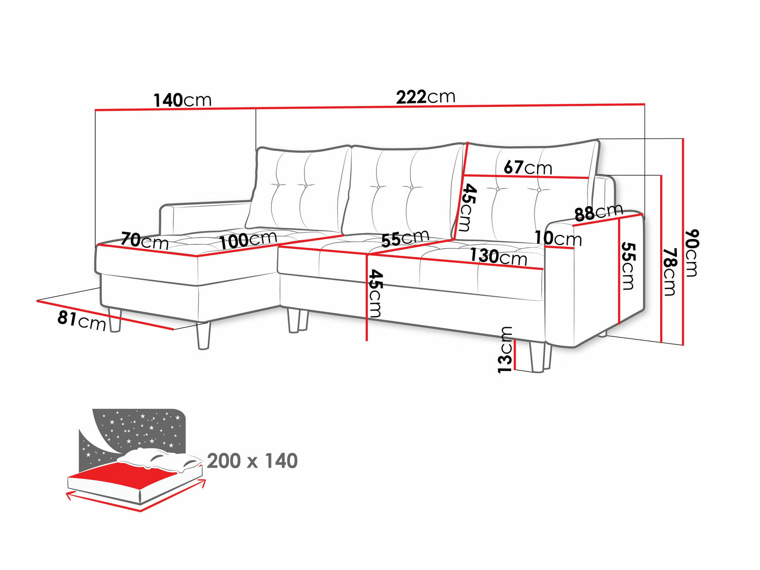 • Bredde på soveområde