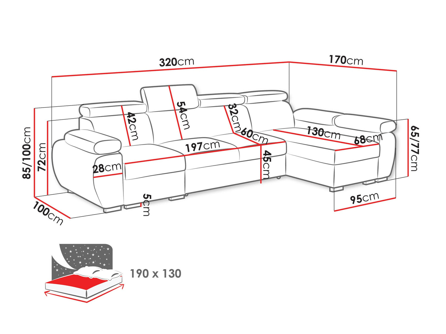Når du ser på sofaen forfra, vil den forlængede del af venstre-varianten være på din venstre side. Den valgte hjørnevariant bør forbedre rummets flow og gøre det let at bevæge sig rundt i rummet.