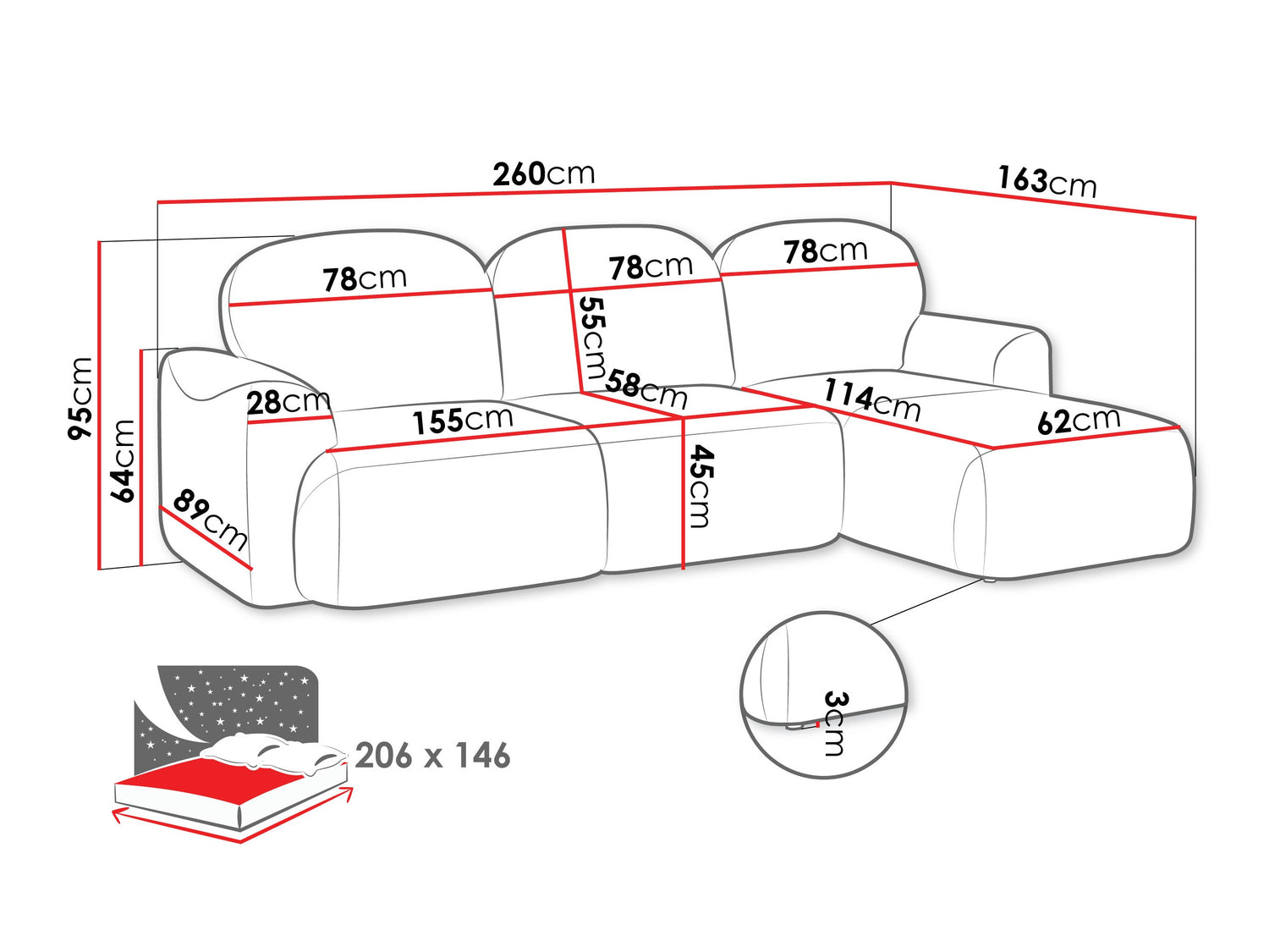 Når du ser på sofaen forfra, vil den forlængede del af højre-varianten være på din højre side. Den valgte hjørnevariant bør forbedre rummets flow og gøre det let at bevæge sig rundt i rummet.