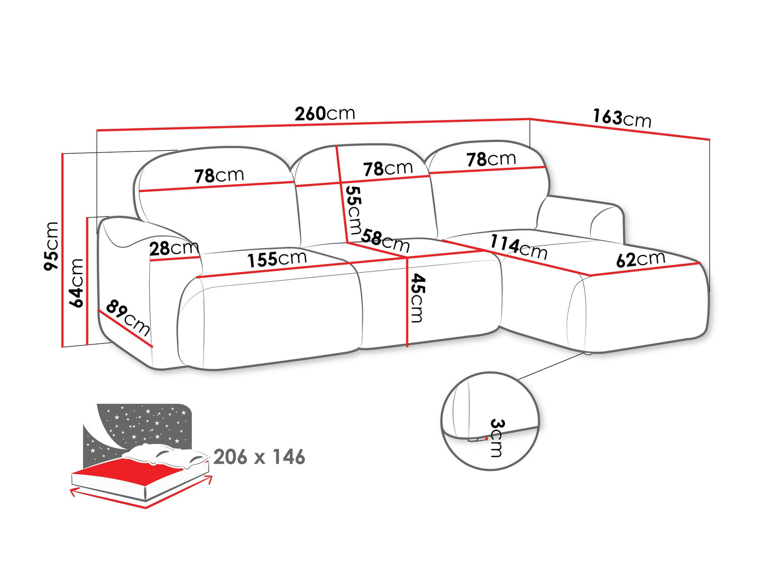 Når du ser på sofaen forfra, vil den forlængede del af venstre-varianten være på din venstre side. Den valgte hjørnevariant bør forbedre rummets flow og gøre det let at bevæge sig rundt i rummet.