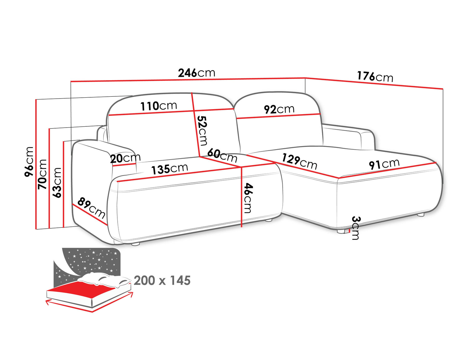 Når du ser på sofaen forfra, vil den forlængede del af venstre-varianten være på din venstre side. Den valgte hjørnevariant bør forbedre rummets flow og gøre det let at bevæge sig rundt i rummet.