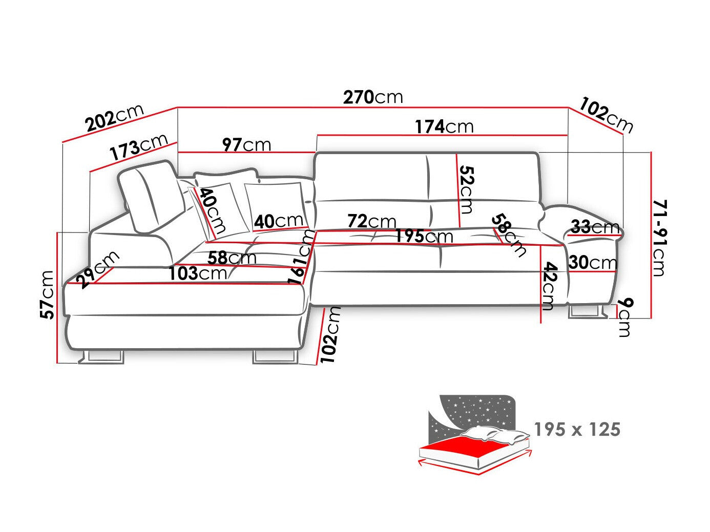 Når du ser på sofaen forfra, vil den forlængede del af venstre-varianten være på din venstre side. Den valgte hjørnevariant bør forbedre rummets flow og gøre det let at bevæge sig rundt i rummet.