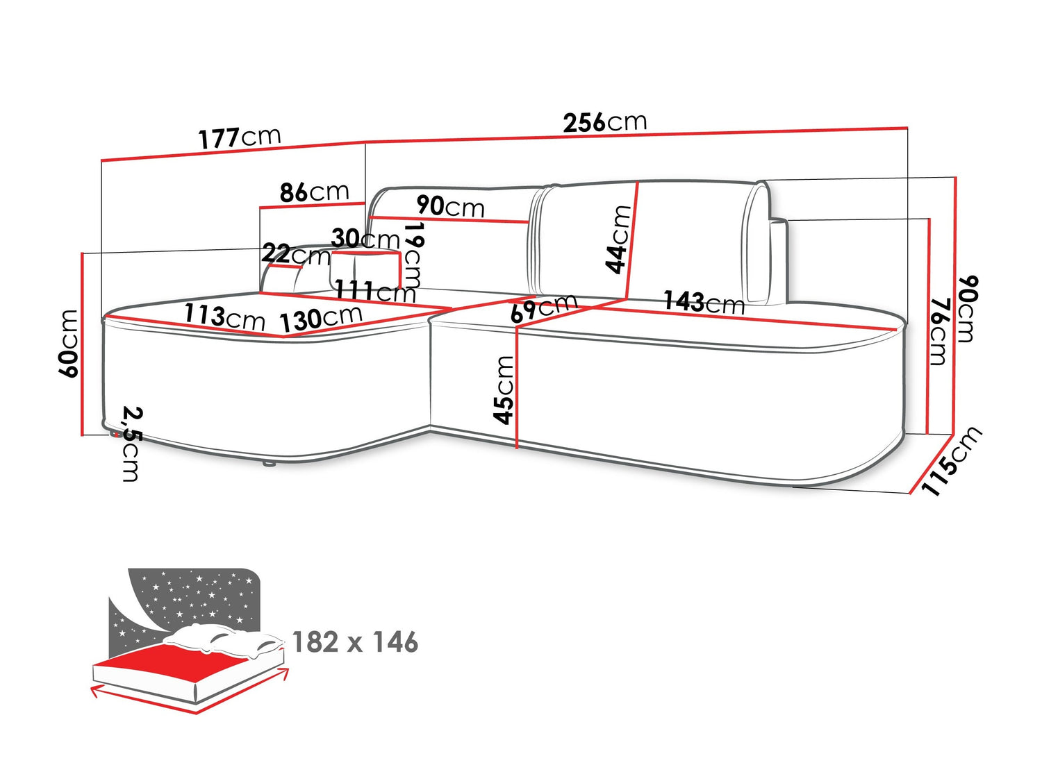 Når du ser på sofaen forfra, vil den forlængede del af venstre-varianten være på din venstre side. Den valgte hjørnevariant bør forbedre rummets flow og gøre det let at bevæge sig rundt i rummet.