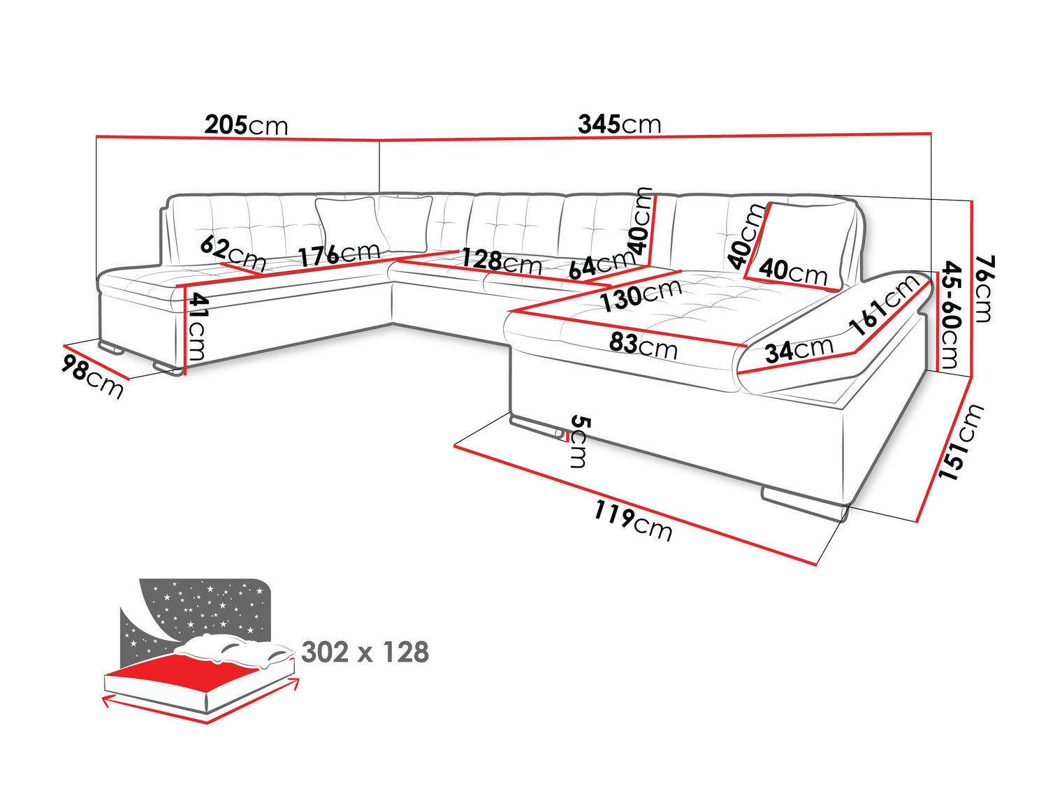 Længde på soveområde302 cm