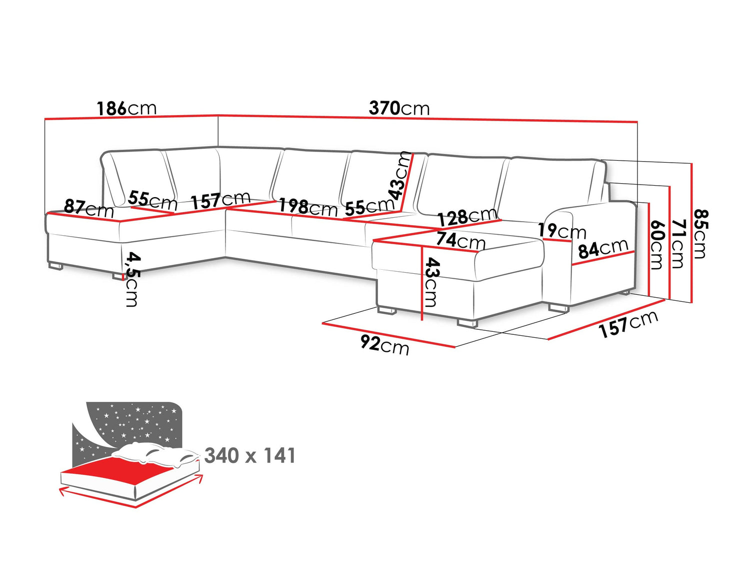 Når du ser på sofaen forfra, vil den forlængede del af højre-varianten være på din højre side. Den valgte hjørnevariant bør forbedre rummets flow og gøre det let at bevæge sig rundt i rummet.