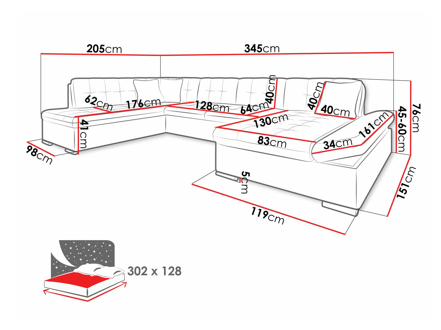 Længde på soveområde302 cm