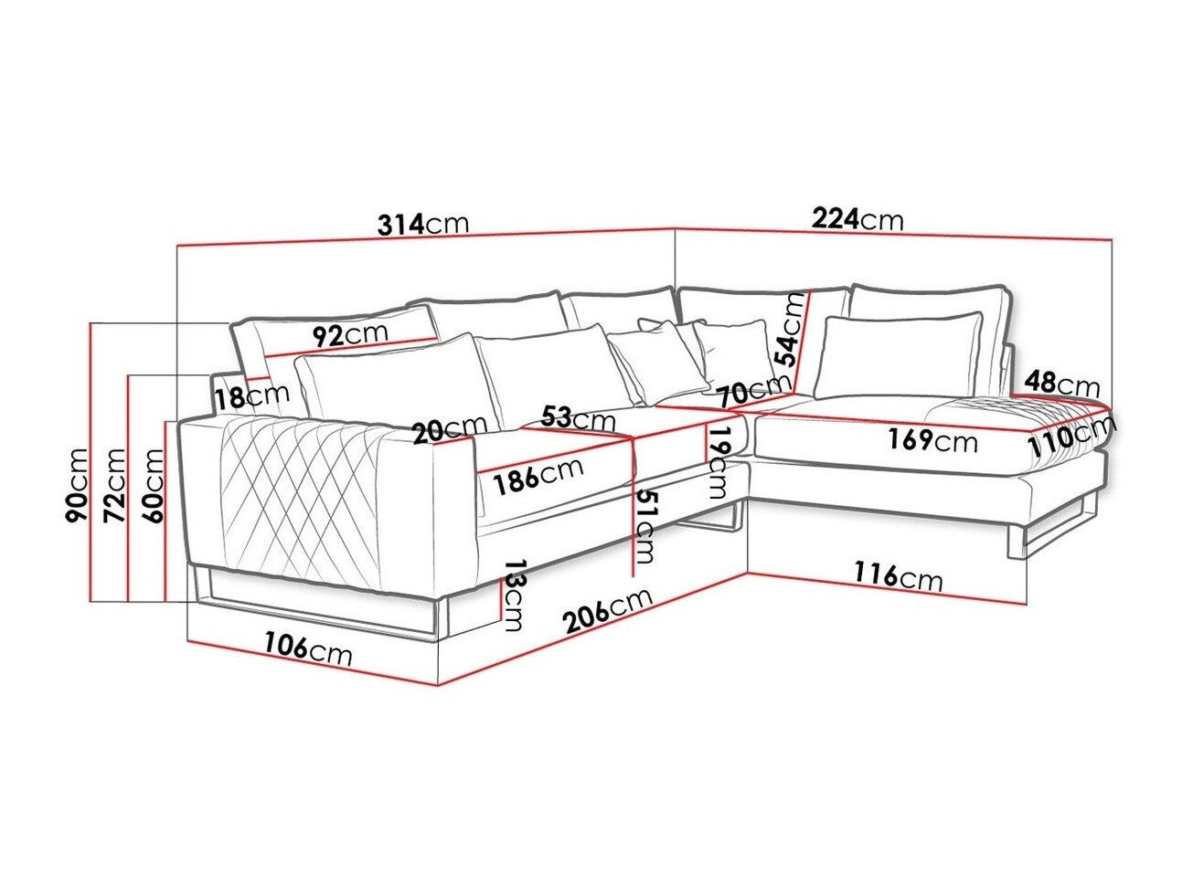 Når du ser på sofaen forfra, vil den forlængede del af venstre-varianten være på din venstre side. Den valgte hjørnevariant bør forbedre rummets flow og gøre det let at bevæge sig rundt i rummet.