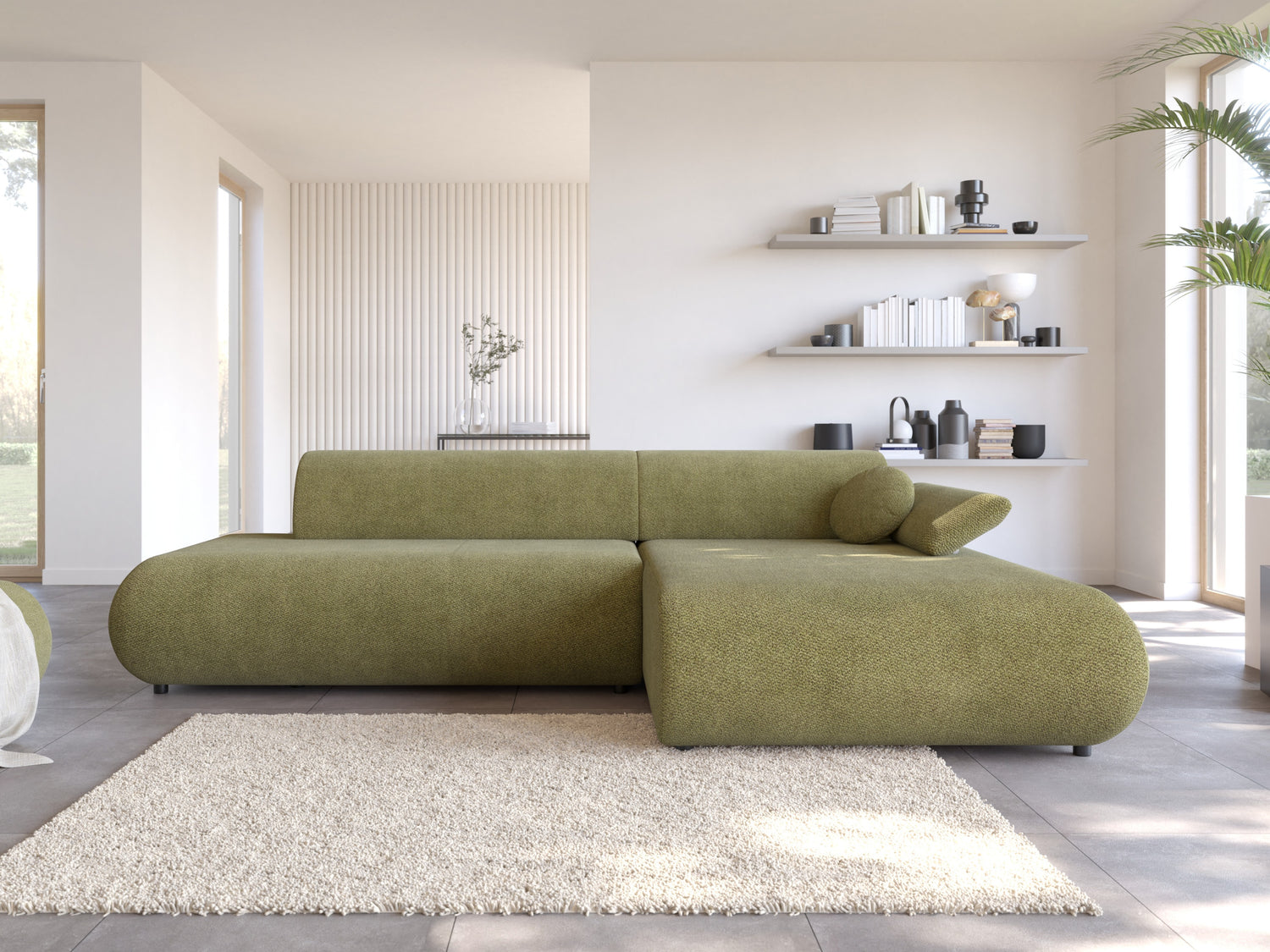 Når du ser på sofaen forfra, vil den forlængede del af højre-varianten være på din højre side. Den valgte hjørnevariant bør forbedre rummets flow og gøre det let at bevæge sig rundt i rummet.