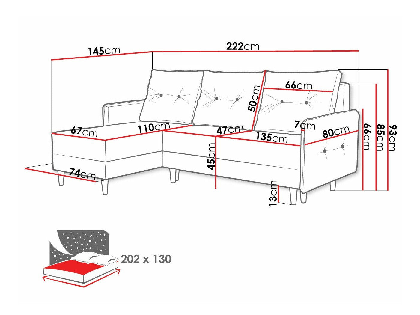 Længde på soveområde202 cm