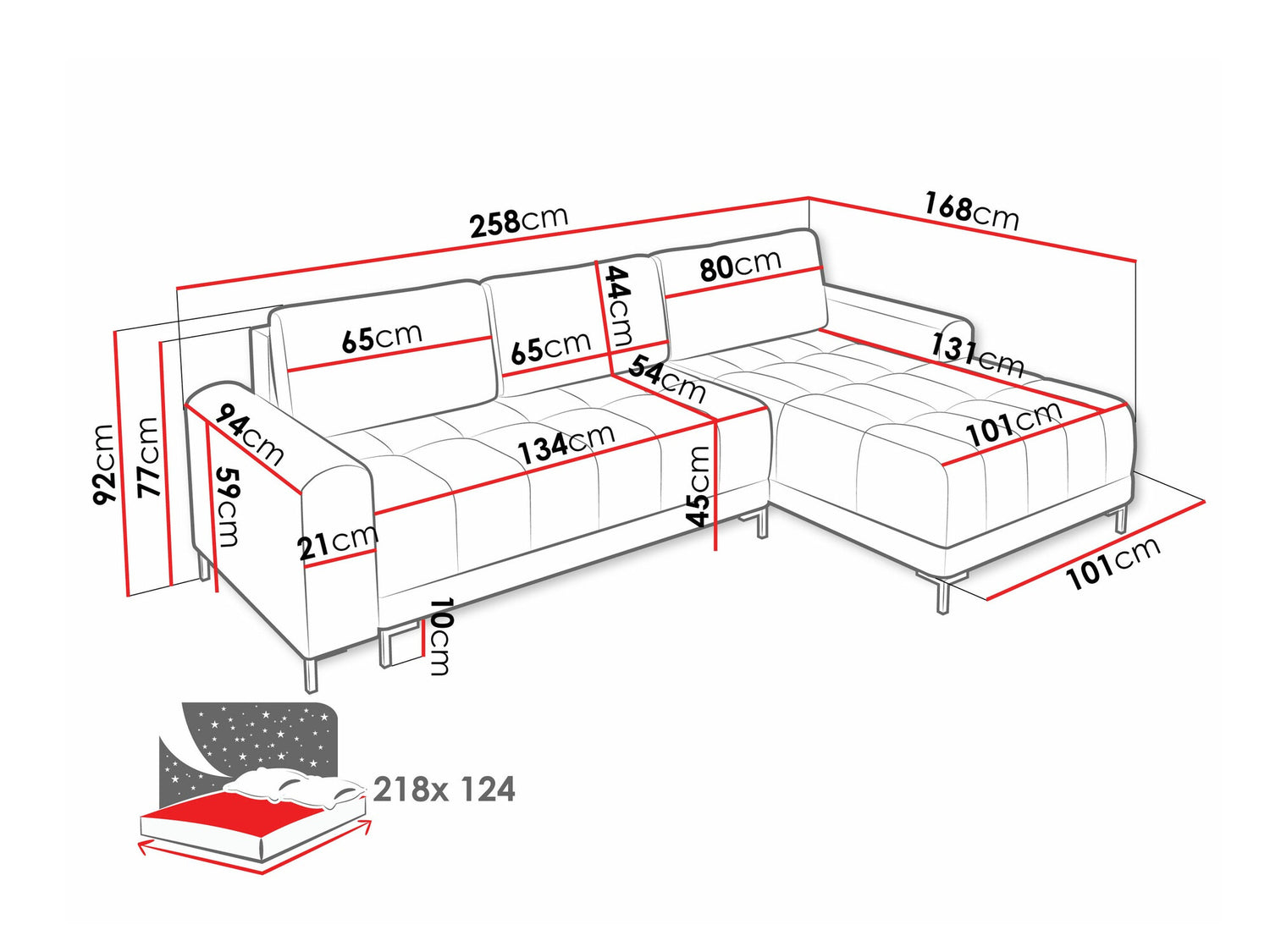 Når du ser på sofaen forfra, vil den forlængede del af venstre-varianten være på din venstre side. Den valgte hjørnevariant bør forbedre rummets flow og gøre det let at bevæge sig rundt i rummet.
