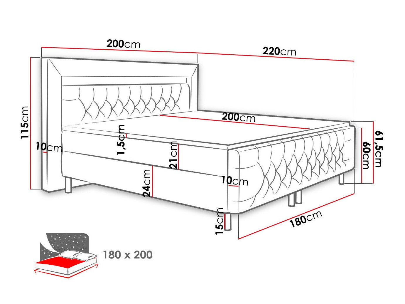 Størrelse på madras180 x 200 cm